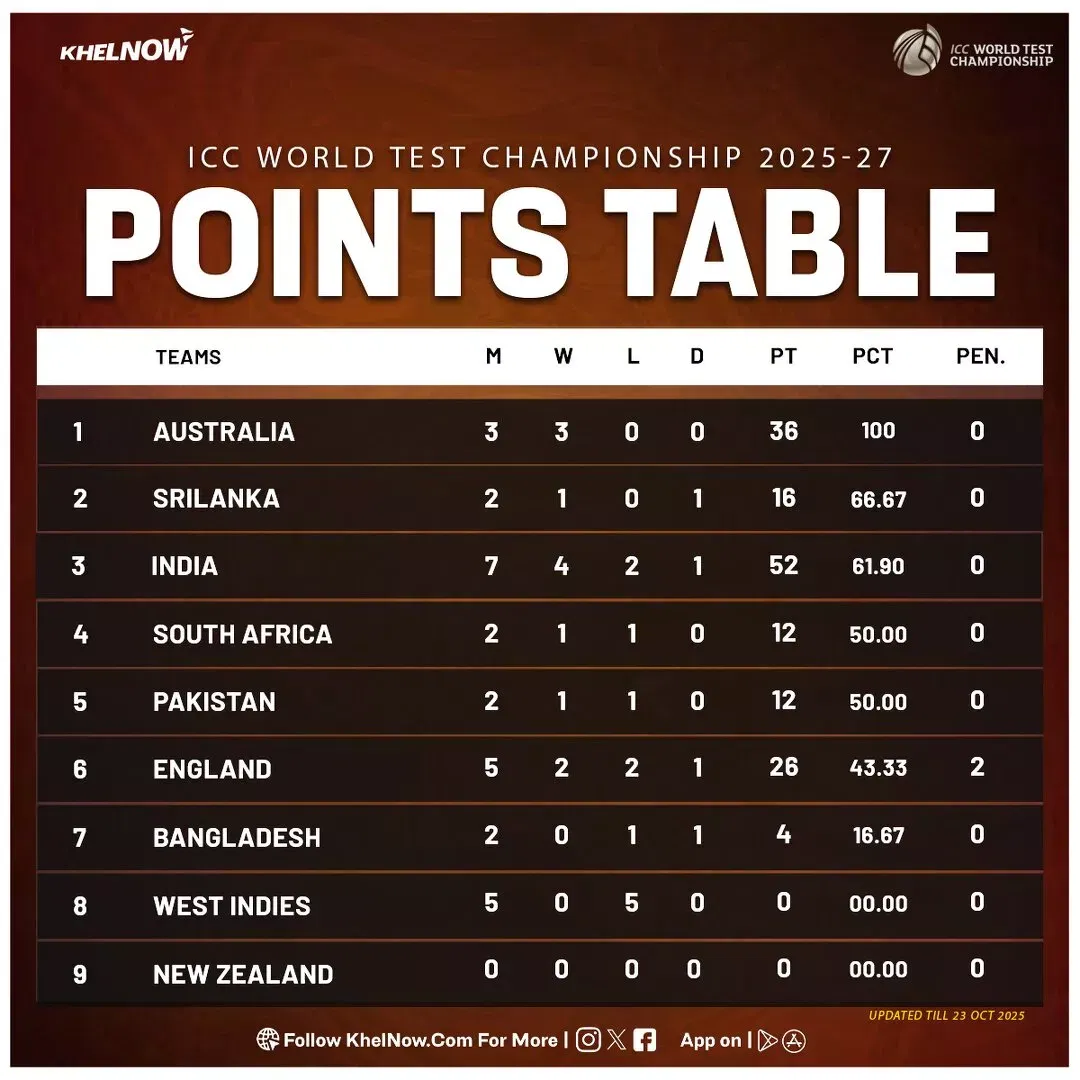 Australia (100.0), Sri Lanka (66.67) and India (61.90) hold the top three spots in ICC WTC 2025-27 points table respectively. England and Bangladesh occupy the sixth and seventh spots, while West Indies languish at bottom of the table with PCT of 0. New Zealand are yet to kick off their campaign.