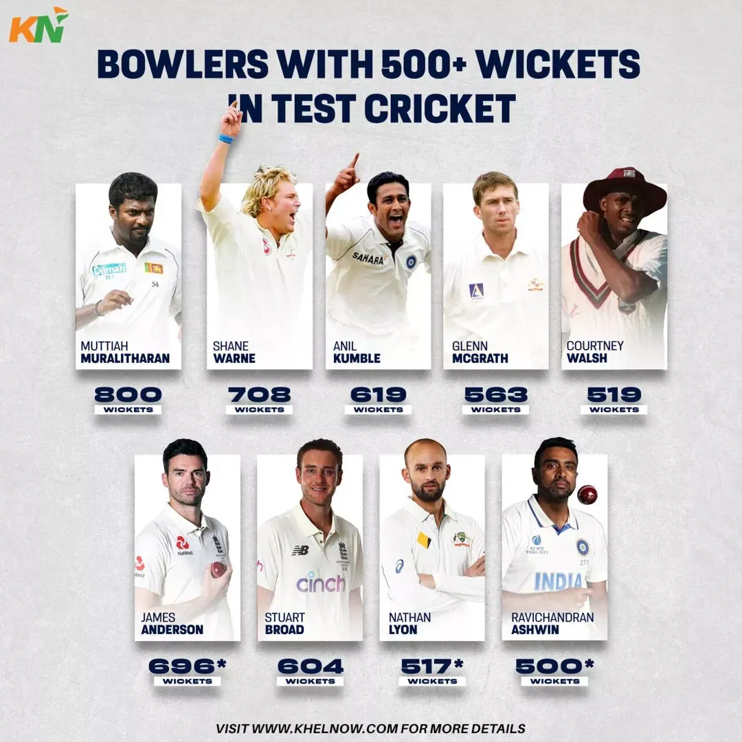 The legendary list includes Muttiah Muralitharan (800), Shane Warne (708), James Anderson (696), Anil Kumble (619), Stuart Broad (604), Glenn McGrath (563), Courtney Walsh (519) and Nathan Lyon (517).
