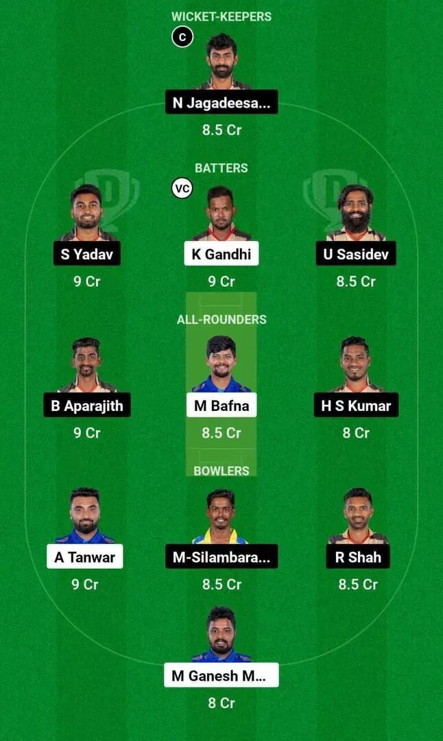 Chepauk Super Gillies: N.Jagadeesan (c,wk), P.Ranjan Paul, S.Yadav, U.Sasidev, R.Sathish, B.Aparajith, HS Kumar, L.Raj, M.Silambarasan, R.Shah, B.Rocky