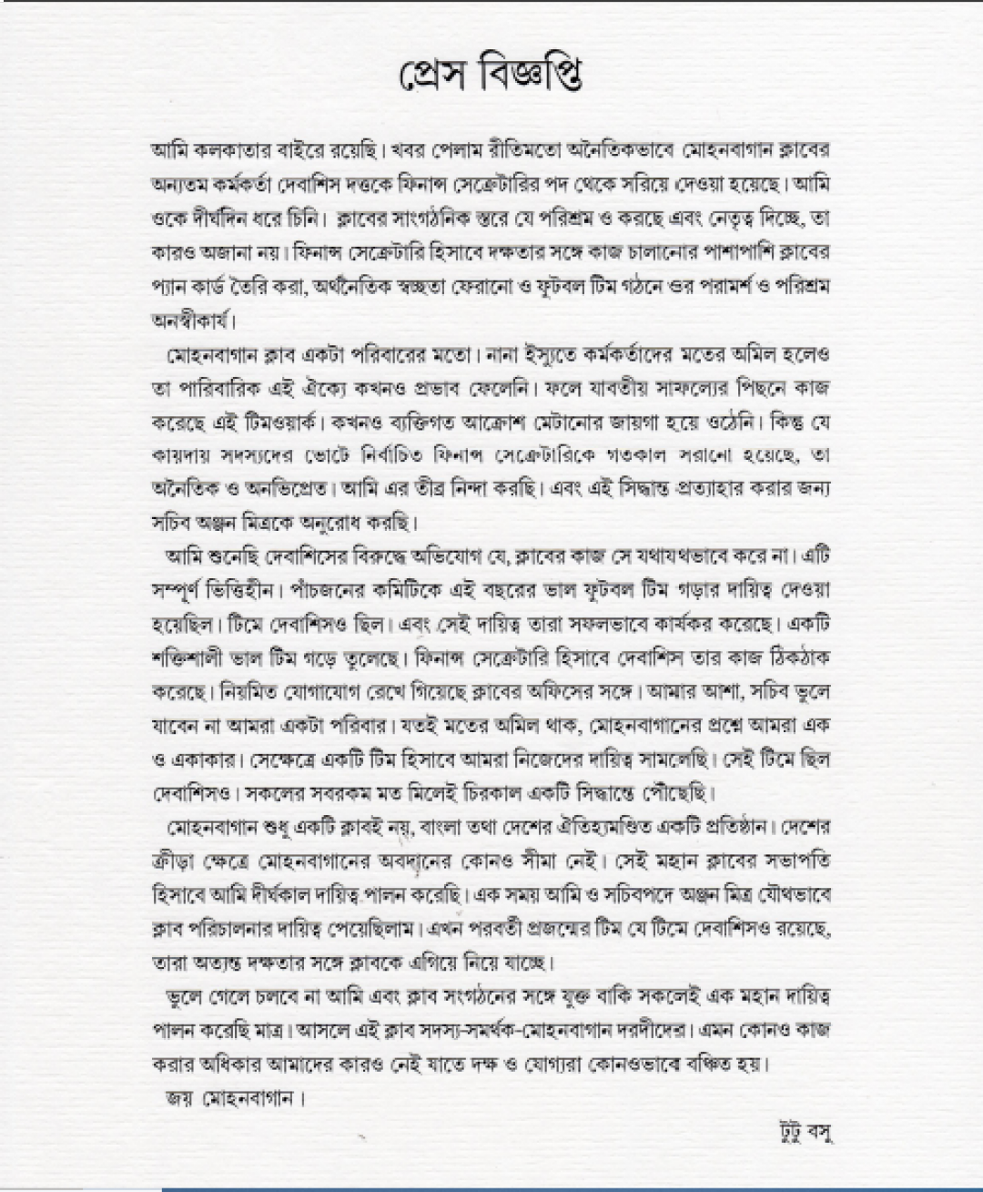 In a dramatic turn of events, Mohun Bagan official Swapan Sadhan Bose (Tutu Bose) has dubbed the belated acceptance of Financial Secretary Debashish Dutta’s resignation letter as ‘immoral.’