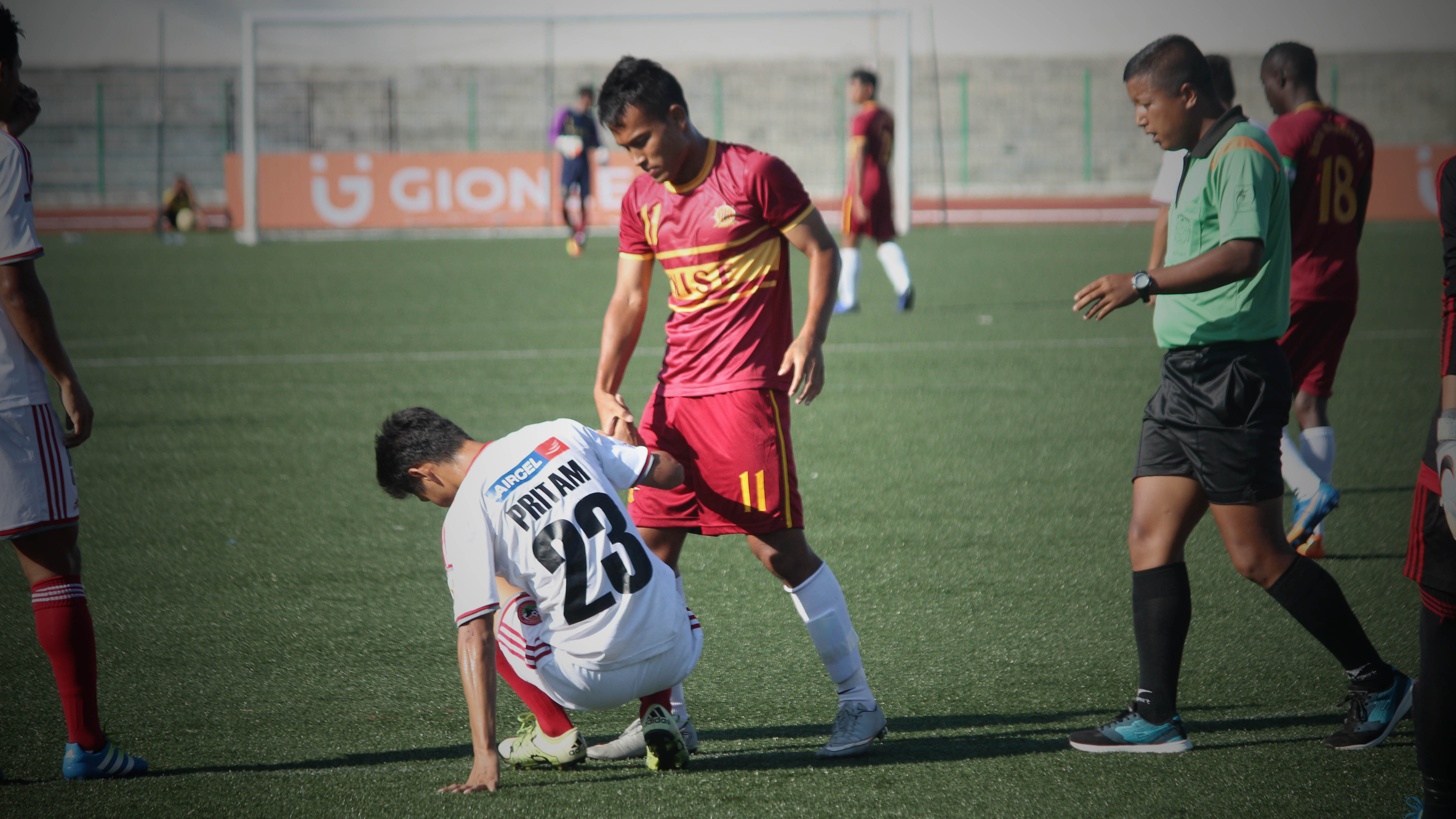 Sushil Meitei helps Lajong Manipuri friend Pritam get on his feet after a foul in what was a fiery encounter between the two sides.
