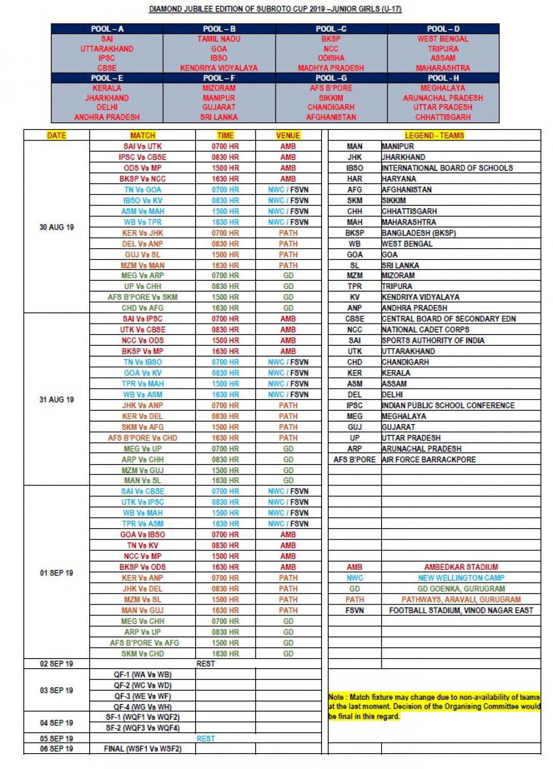 New Wellington Camp Ground, Race Course Road, Subroto Park Football Ground, Football Stadium at East Vinod Nagar in Patparganj, IP Extension, GD Goenka International School and Pathways World School, Gurgram will host the round-robin games.