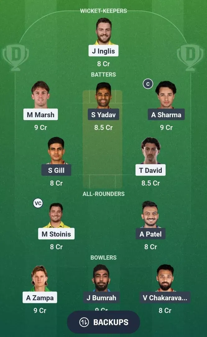 बल्लेबाज: अभिषेक शर्मा, मिचेल मार्श, टिम डेविड, सूर्यकुमार यादव, शुभमन गिल