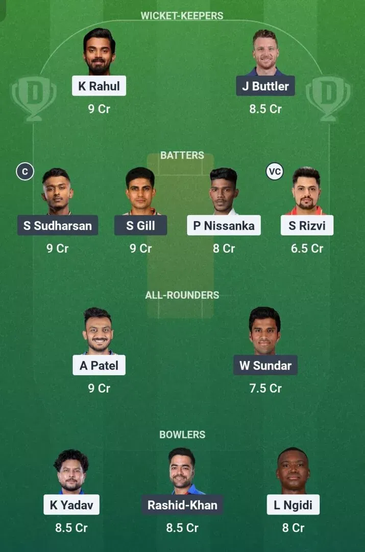 दिल्ली कैपिटल्स: केएल राहुल (विकेटकीपर), पथुम निसांका, नीतिश राणा, समीर रिजवी, अक्षर पटेल (कप्तान), ट्रिस्टन स्टब्स, डेविड मिलर, लुंगी एनगिडी, कुलदीप यादव, टी नटराजन, मुकेश कुमार। (इम्पैक्ट प्लेयर – विप्रज निगम)