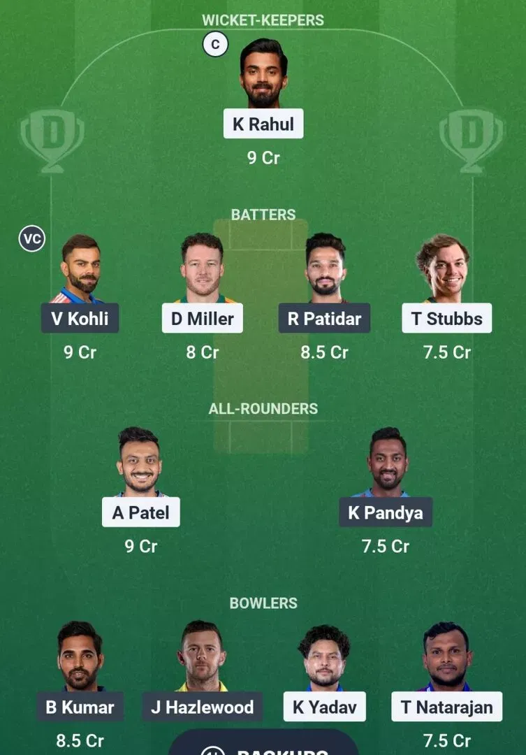 बल्लेबाज: विराट कोहली, रजत पाटीदार, ट्रिस्टन स्टब्स, डेविड मिलर