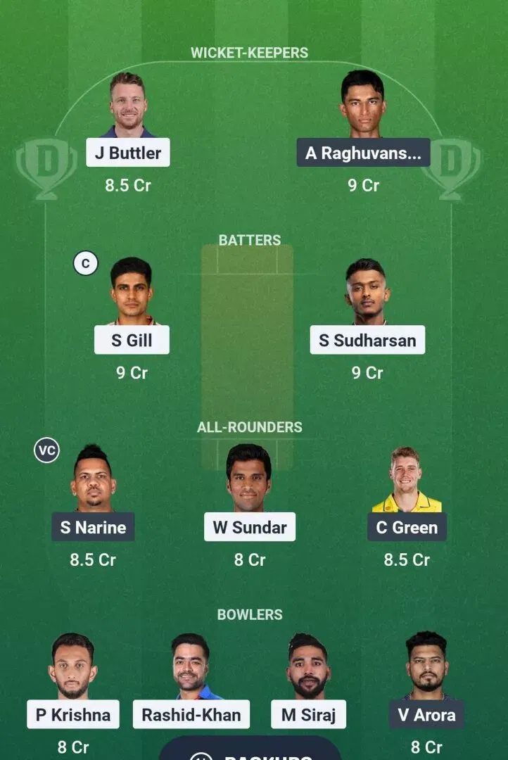 गुजरात टाइटंस: साई सुदर्शन, शुभमन गिल (कप्तान), जोस बटलर (विकेटकीपर), वॉशिंगटन सुंदर, ग्लेन फिलिप्स, राहुल तेवतिया, राशिद खान, कगिसो रबाडा, मोहम्मद सिराज, अशोक शर्मा, प्रसिद्ध कृष्णा। (इम्पैक्ट प्लेयर – शाहरुख खान)