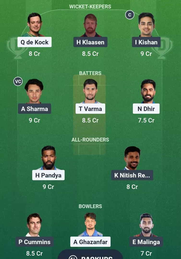 सनराइजर्स हैदराबाद: अभिषेक शर्मा, ईशान किशन, हेनरिक क्लासेन, सलिल अरोड़ा (विकेटकीपर), अनिकेत वर्मा, नीतिश कुमार रेड्डी, पैट कमिंस (कप्तान), शिवांग कुमार, साकिब हुसैन, प्रफुल हिंगे, ईशान मलिंगा। (इम्पैक्ट प्लेयर – ट्रैविस हेड)