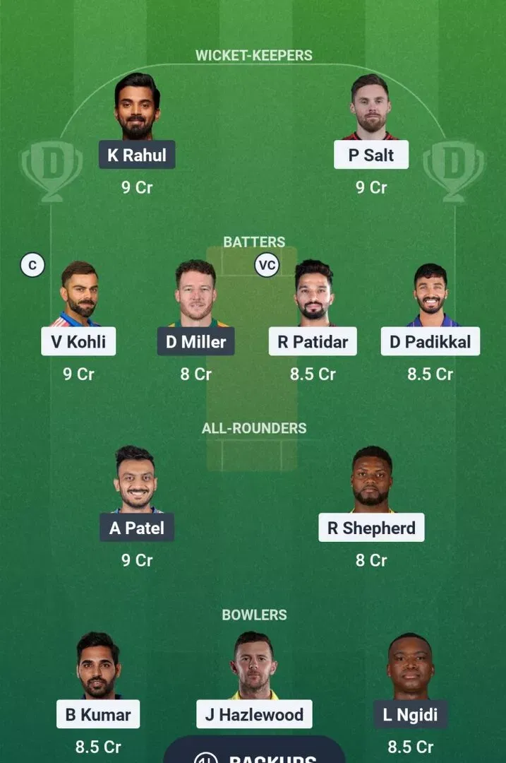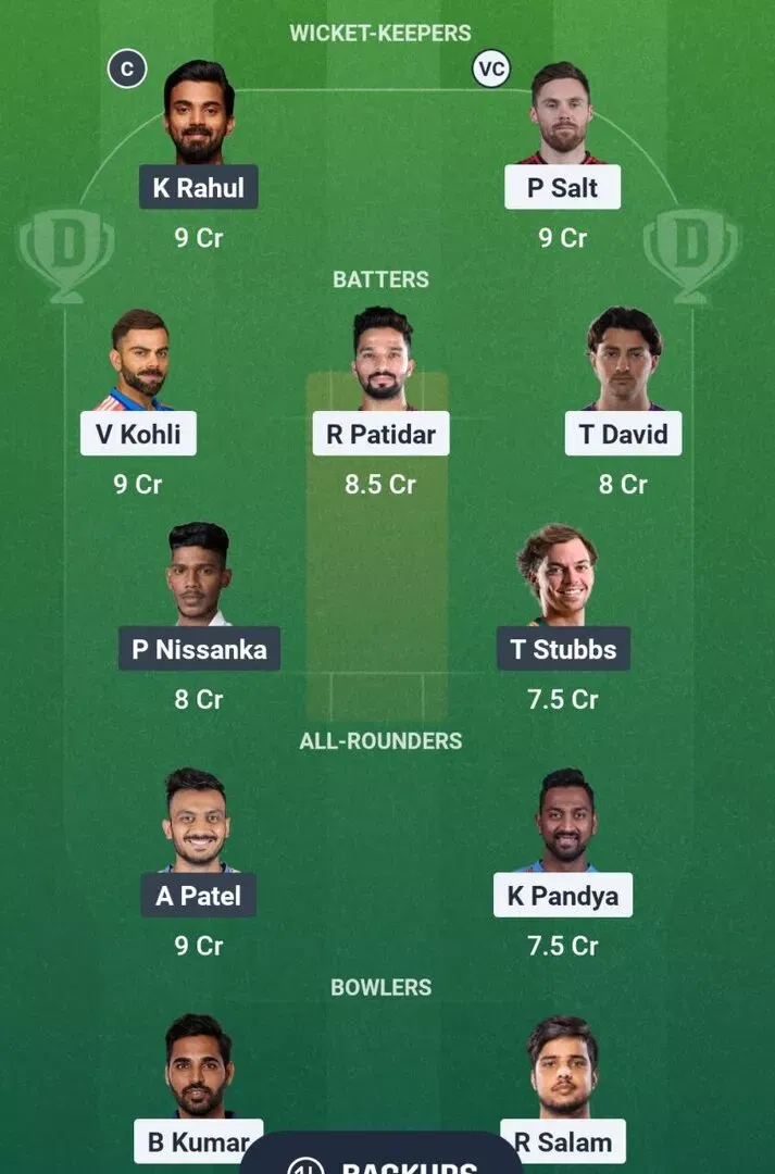 बल्लेबाज: विराट कोहली, रजत पाटीदार, टिम डेविड, पाथुम निसांका, ट्रिस्टन स्टब्स
