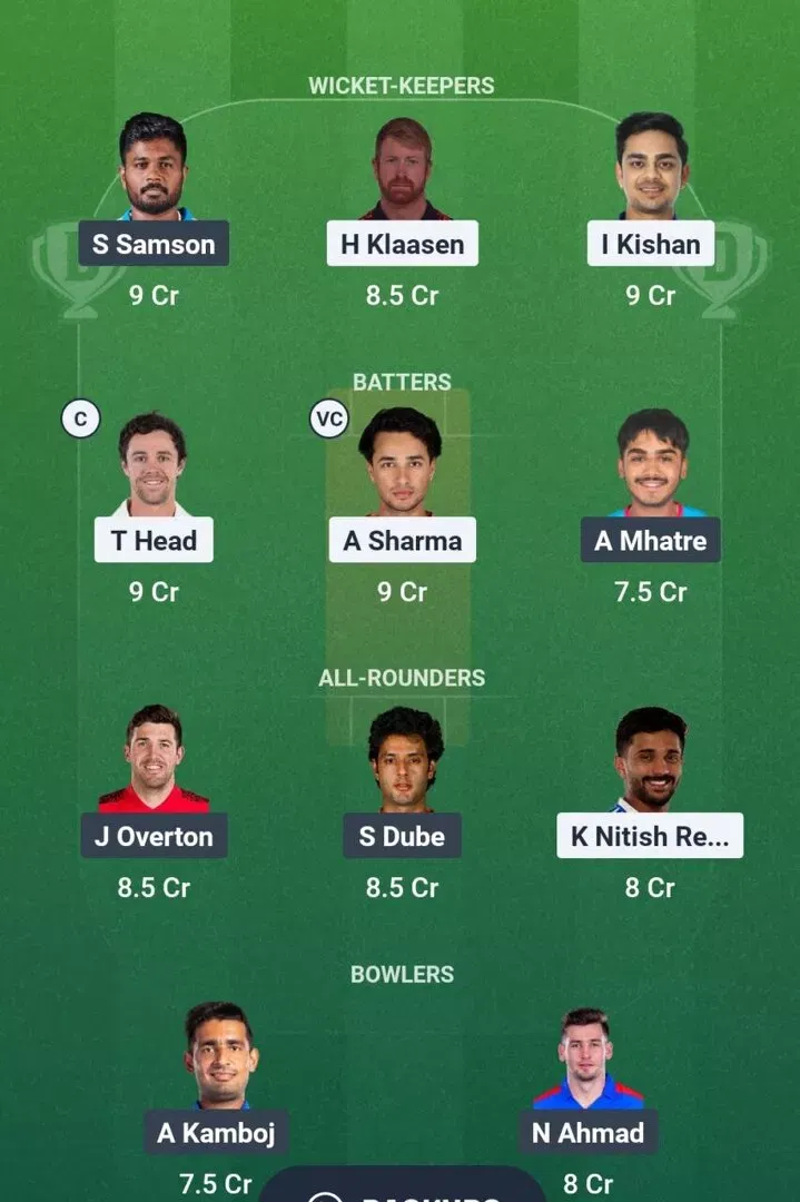 सनराइजर्स हैदराबाद: अभिषेक शर्मा, ट्रैविस हेड, ईशान किशन (कप्तान), हेनरिक क्लासेन, सलिल अरोड़ा (विकेटकीपर), अनिकेत वर्मा, नीतिश कुमार रेड्डी, हर्ष दुबे, शिवांग कुमार, प्रफुल हिंगे, ईशान मलिंगा। (इम्पैक्ट प्लेयर – साकिब हुसैन)