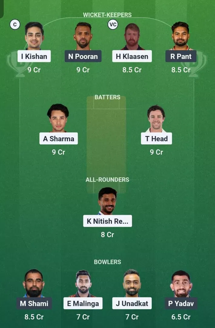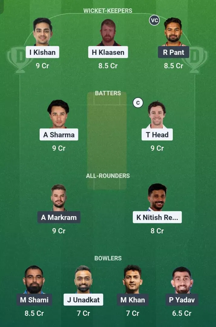 सनराइजर्स हैदराबाद: अभिषेक शर्मा, ट्रैविस हेड, ईशान किशन (कप्तान और विकेटकीपर), हेनरिक क्लासेन, अनिकेत वर्मा, नीतिश कुमार रेड्डी, सलिल अरोड़ा, हर्ष दुबे, शिवांग कुमार, जयदेव उनादकट, डेविड पेन। (इम्पैक्ट प्लेयर – ईशान मलिंगा)
