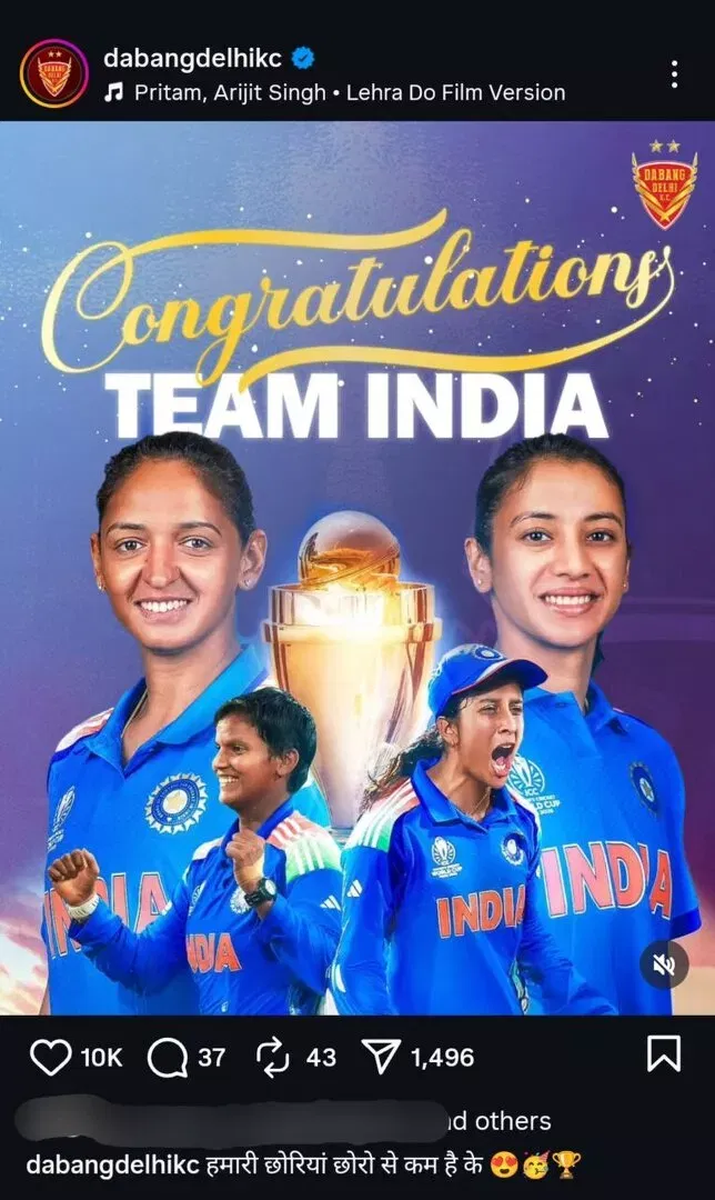 Many teams took to social media to celebrate India’s historic World Cup win, including the PKL Season 12 champions, Dabang Delhi. They shared a post on Instagram with the caption, “हमारी छोरियां छोरो से कम हैं के,” which translates to “Our girls are no less than the boys.”